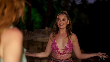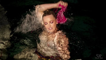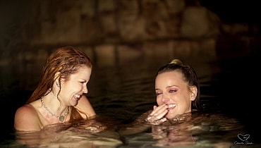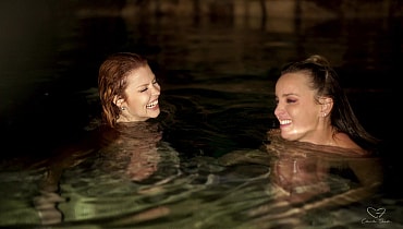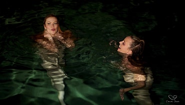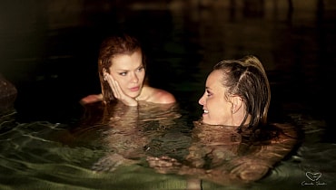 Elly and Charlie break into a friend's family home to use their pool before a party. Charlie dares Elly to go skinny dipping with her, and Elly is really nervous. After some persuading however, she jumps in and they float around the pool, chatting deeply. Charlie reveals that she is nervous that she might like girls but her conservative family may prevent her from ever trying to date them. Elly admits that she also wants to experiment, and that perhaps they should try together. The girls start kissing, then move to the shallows of the pool and fuck each other playfully, with lots of giggles and smiles. Charlie keeps telling Elly to add more fingers until she's being fisted. Charlie also squirts all through the pool. The girls decide that they should keep playing around in the future.
